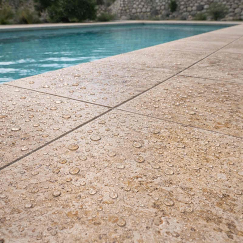 Oui. Le travertin est naturellement poreux et absorbe rapidement l’eau. Le traitement réduit cette imprégnation et limite l’encrassement lié aux projections répétées. Il améliore la tenue esthétique des plages et margelles sans modifier la texture de la pierre et sans créer de surface glissante. La protection contribue aussi à ralentir l’apparition des dépôts liés à l’humidité permanente.