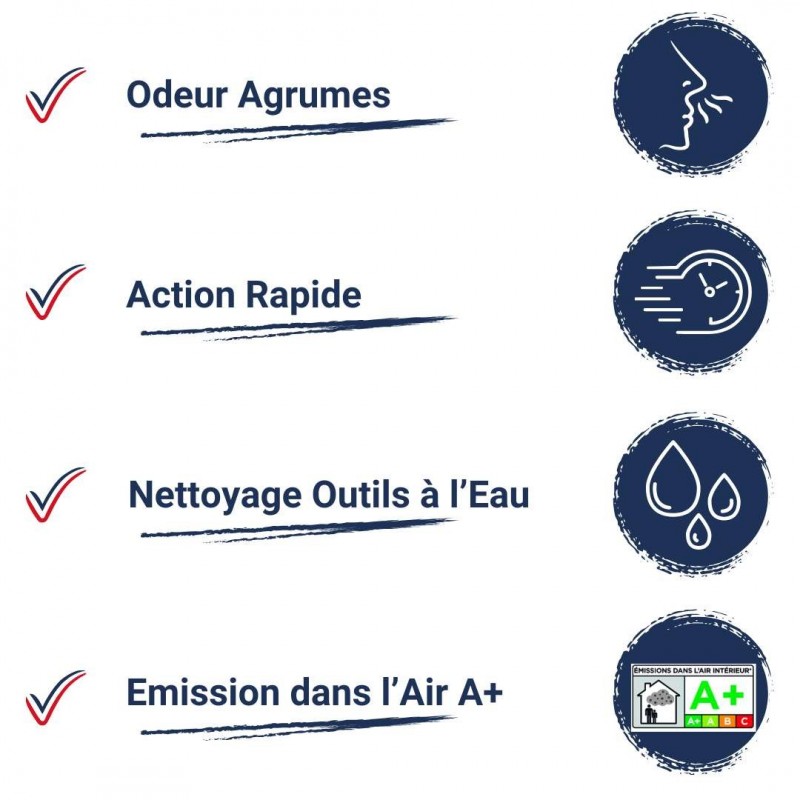• Point fort 5 : Séchage rapide sans coloration, permettant une mise en finition ou un ponçage immédiat sans encrassement des abrasifs.